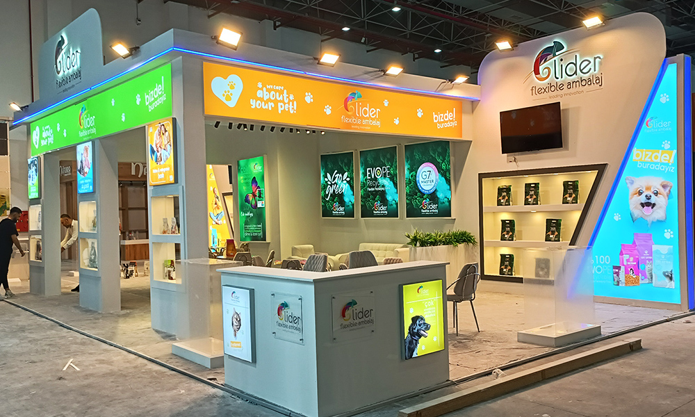 This design we made at the 2024 Izmir Türkiye fairground is a customizable disposable wooden custom-made exhibition stand. White and black chipboard were selected as the material for the stand construction and the signage selection was applied as hidden LED illuminated foam letter cutting.