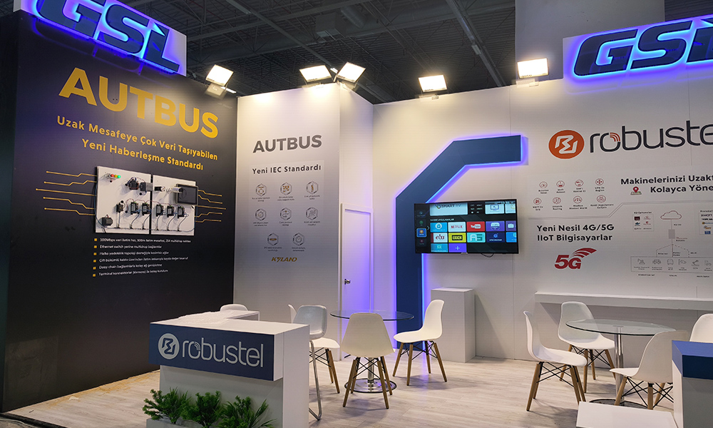 This design, which we made at the 2024 Industry 4.0 Istanbul IFM fairground, is a customizable disposable wooden custom-made exhibition stand. White and black chipboard were selected as the material for the stand construction and the signage selection was applied as hidden LED illuminated foam letter cutting.